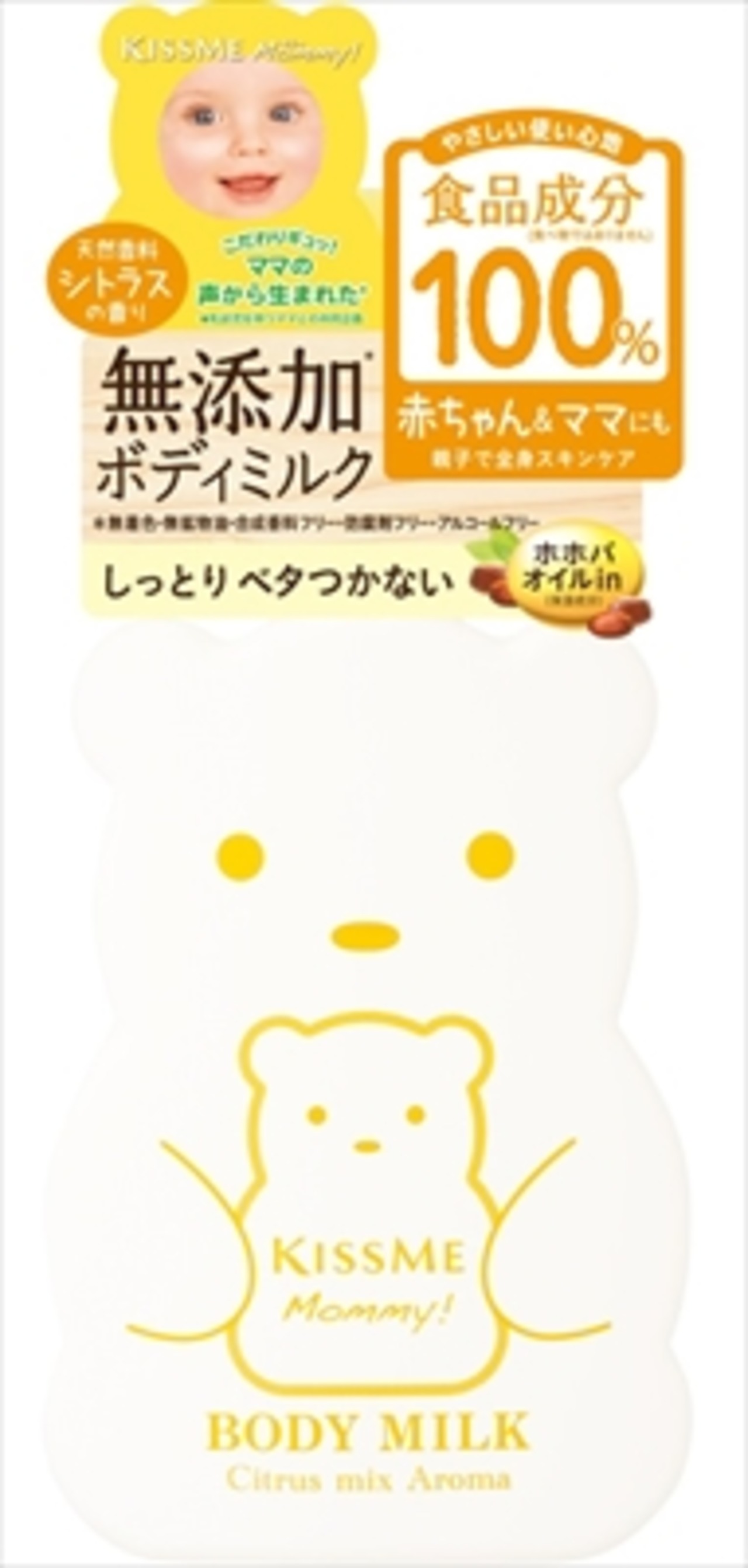 ■【説明】:100%食品成分で作った無添加ボディミルク。軽く伸びて、しっとりベタつかない。親子で使えるやさしい使い心地。天然精油のシトラスの香り。