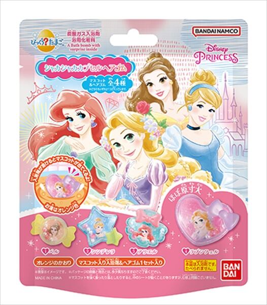 ■【説明】:キラキラビーズがラメ入りクリアカプセルにぎゅっと詰まった、かわいいアクセサリーヘアゴムがディスニープリンセスデザインで登場!マスコット全4種類。オレンジの香り、オレンジ色のお湯。