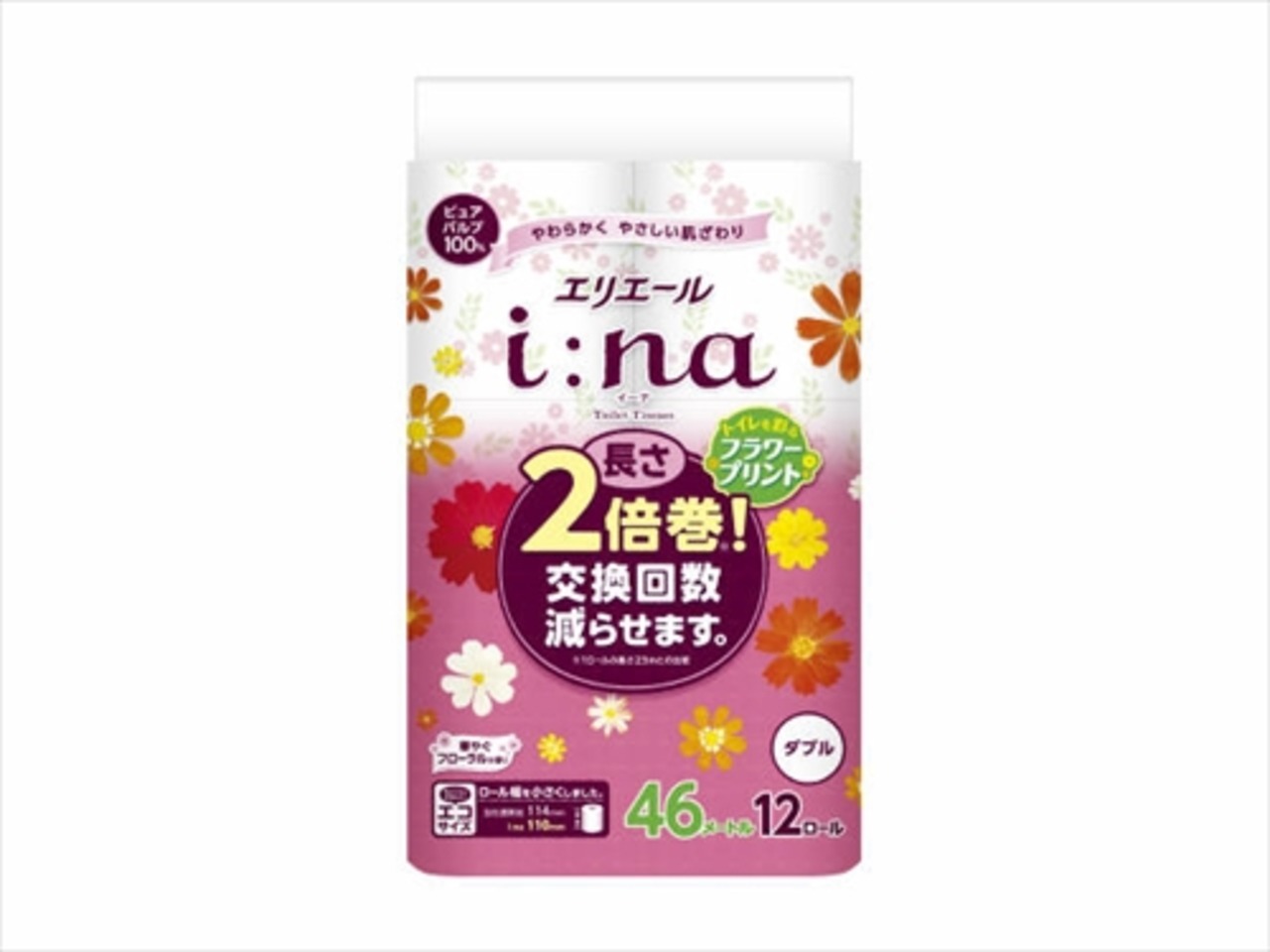■【説明】:●長さ2倍巻の46mでたっぷり長持ち。※1ロールの長さ23mとの比較。●トイレを明るい雰囲気にするフラワー柄のプリント。●面倒なトイレットペーパーの交換回数の軽減。●握りやすく、開けやすい取手形状。●華やぐフローラルの香り。●パルプ100%。