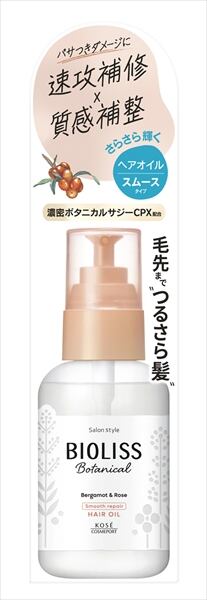 ■【説明】:パサつきダメージに、1本でトリートメント&スタイルメイクを叶える、濃密ボタニカルサジー配合のスムースリペアヘアオイル。風のように軽やかで輝きまとってまとまりつづく、つるさら髪へ。みずみずしく可憐なベルガモット&ローズの香り。