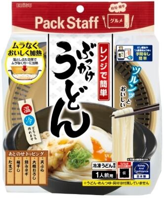 ■【説明】:温・冷2通りのぶっかけうどん1人前が、簡単に作れるレンジ調理容器が新登場。落としぶた効果で水分がうどん全体にいきわたり、加熱ムラのないツルツルなうどんができる。