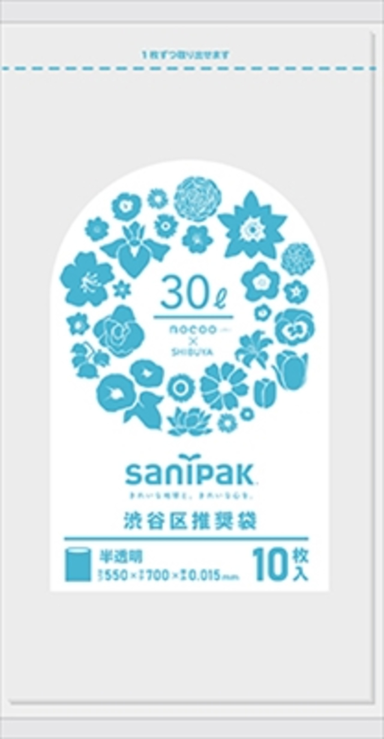 ■【説明】:渋谷区推奨ゴミ袋。袋に花柄をデザインし、ゴミステーションをお花畑にするプロジェクト商品。二酸化炭素削減素材を用いており、環境に配慮したゴミ袋です。