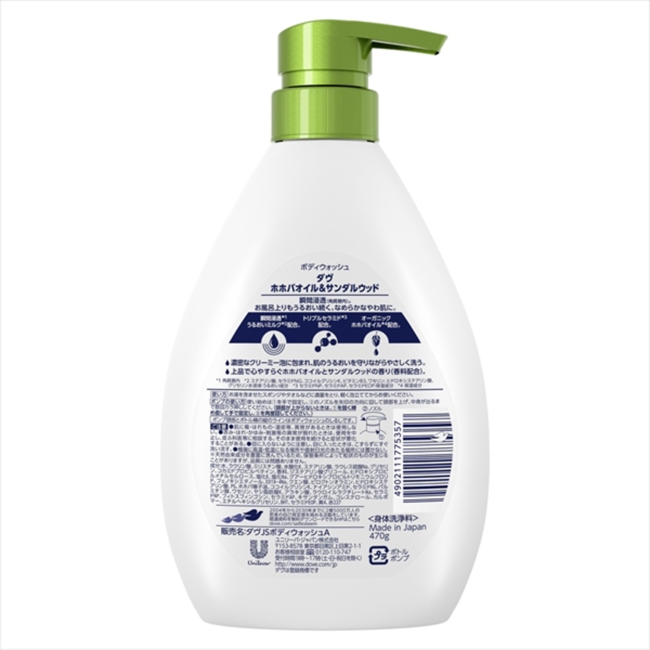 ■【説明】:瞬間浸透*1うるおいミルク*2配合。お風呂上りもうるおい続く。なめらかなやわ肌に。オーガニックホホバオイル*3配合。濃蜜なクリーミー泡で、肌のうるおいを守りながらやさしく洗う。上品で心やすらぐホホバオイルとサンダルウッドの香り(香料配合)。*1角質層内 *2ステアリン酸、セラミドNG、ココイルグリシンK、ビタミンB3、ワセリン、ヒドロキシステアリン酸、グリセリン水溶液:うるおい成分 *3保湿成分