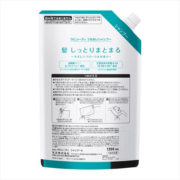 ■【説明】:「ラビューティ」 それは”美の予感”。なめらかな指通りの業務用シャンプー。髪の摩擦を抑えて絡まりを防ぎ、しっとりまとまりやすい髪へ導きます。上質な使い心地で、髪、しっとりまとまる。やさしいフローラルの香り。BIB(バックインボックス)タイプよりも”つめかえロス”(=残量)が減らせるパウチタイプ。