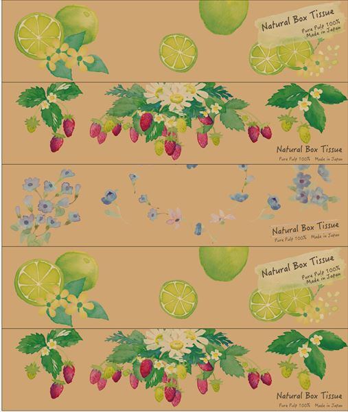 ■【説明】:一般的なティシューと比べ嵩が高く、ふんわり柔らかなティシュー。厳選されたピュアパルプ100%を使用。クラフトボックスカートン採用。フルーツやお花を自然な色合いで表現した爽やかなデザイン。