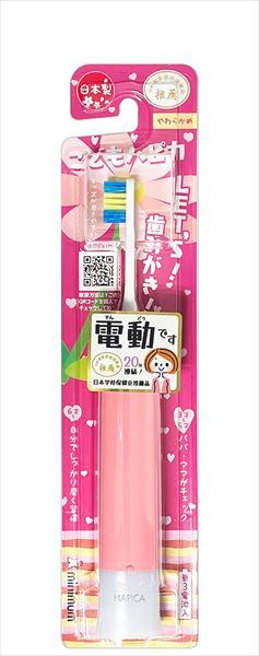 ■【説明】:子供向け。安心安全の日本製電動歯ブラシです。公益財団法人日本学校保健会の推薦品。当社比で40%薄くなったブラシヘッドでお口のすみずみまでさらに届きやすい。
