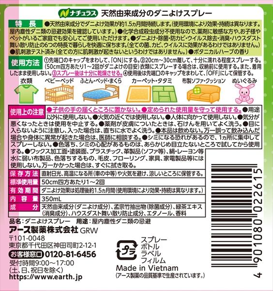 ■【説明】:化学殺虫成分不使用で、ダニの嫌がる天然アロマを配合したスプレータイプのダニよけです。効果は約1.5ヵ月持続します。ダニよけ、除菌、防カビ、ウィルス除去、消臭、ハウスダスト除去の6つの効果があります。