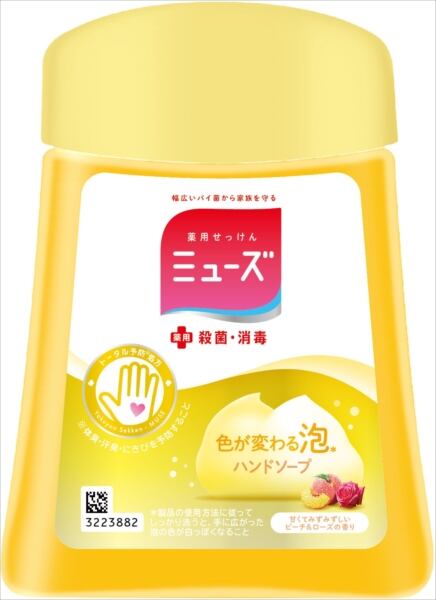 ■【説明】:ミューズノータッチ本体につけかえてお使いいただく泡タイプのハンドソープ。本体にセットしてノズルの下に手をかざすと、手洗い約1回分(約1ml)が出てきます。殺菌成分配合。黄色の泡。しっかり洗っているうちに泡が白っぽくなり、手の隅々まで泡を広げられます。しっかり殺菌。殺菌成分配合。天然由来洗浄成分配合(*1)。 保湿成分濃グリセリン配合(*2) 。肌に近いスキンpH。