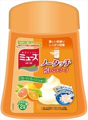 ■【説明】:「ミューズノータッチ泡ハンドソープボトル フルーティフレッシュの香り 250ml」は、ミューズノータッチ本体につけかえてお使いいただく泡タイプのハンドソープ。本体にセットしてノズルの下に手をかざすと、手洗い約1回分(約1ml)が出てきます。ポンプを押す必要がないため衛生的で、いつでも簡単に手が洗えます。幅広いバイ菌をしっかり殺菌・消毒するとともに、3つの保湿成分が手のかさつきを。さわやかなフルーティーフレッシュの香りで毎日の手洗い習慣を楽しく。