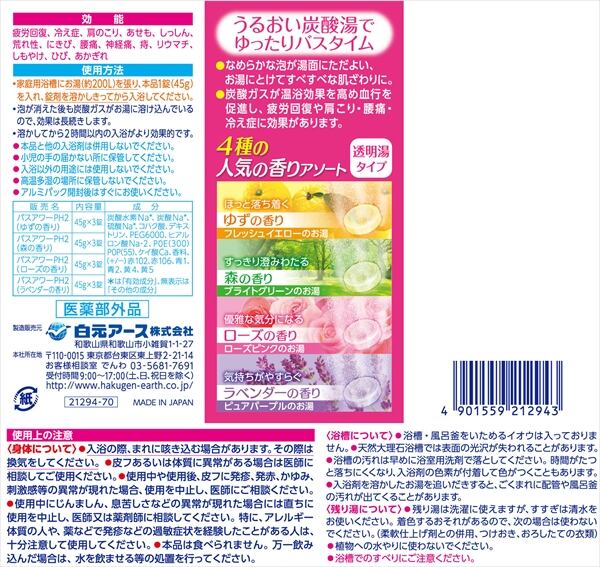 ■【説明】:スキンケアタイプの炭酸ガスの薬用入浴剤。なめらかな泡が湯面にただよい、すべすべな肌ざわりに。ヒアルロン酸(保湿成分)配合。4種の人気の香りが楽しめます。