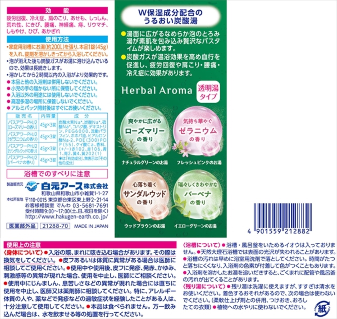 ■【説明】:スキンケアタイプの炭酸ガスの薬用入浴剤。なめらか泡のぜい沢とろみ湯ですべすべな肌ざわりに。ヒアルロン酸&ホホバオイル(保湿成分)配合。ハーバルアロマのうるおい炭酸湯でリフレッシュタイムを。