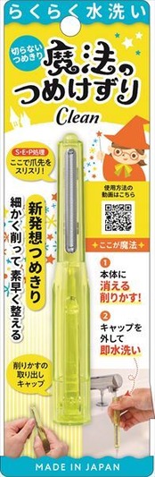 ■【説明】:「切らないつめきり!」みるみる削れて爪粉は本体内部に入ります。しかも削った爪の先端は「キラッ!」と輝く仕上がりに!クリア素材の本体だから爪粉を捨てるタイミングが分りやすい。下キャップを外すとスティック,本体と、キャップとばらけるので爪粉を捨てやすく同時に丸洗いが可能!