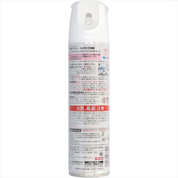 ■【説明】:●イオンパワーとワイド噴射で悪臭を瞬間消臭するトイレ用消臭スプレー●ジューシーな白桃をイメージしたフルーティグリーンフローラルの香り●除菌効果でいつも清潔に保てる●持ちやすい細身の缶サイズ