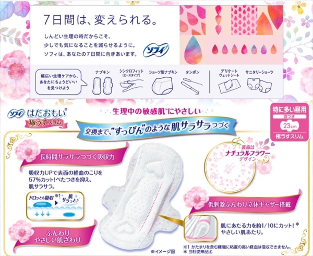 ■【説明】:はだおもいは、生理中の敏感肌にやさしいナプキンです。その理由は、長時間吸収力が持続して、交換まですっぴんのようなサラサラ感がつづくからです。