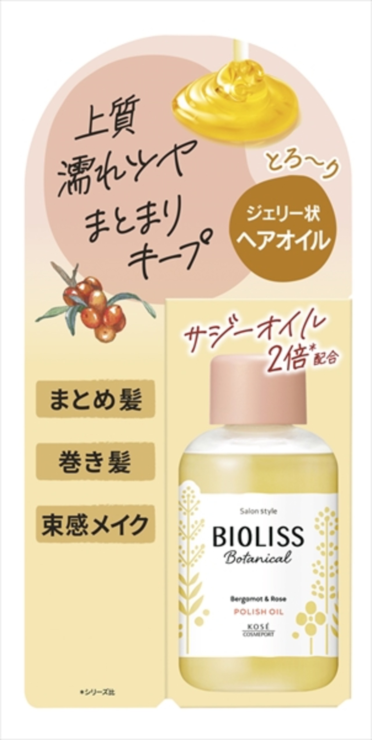 ■【説明】:1本でトリートメント&スタイルメイクを叶える、濃密ボタニカルサジーCPX配合のポリッシュオイル。新感覚のジェリー状ヘアオイルで、“濡れツヤ”דスタイルキープ”。みずみずしく可憐なベルガモット&ローズの香り。