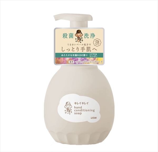 ■【説明】:殺菌・洗浄+うるおいベール処方でしっとり手肌へ。きちんと殺菌してバイ菌から手肌を守りながら、「うるおいベール」が手洗い後も手肌にとどまる、泡タイプのキレイキレイ薬用ハンドコンディショニングソープ。●石けん成分を従来品*の1.6倍配合。*キレイキレイ薬用泡ハンドソープ●インテリアになじむシンプルなボトルデザイン●バイ菌を増やさない抗菌ポンプヘッド採用●あたたかな木漏れ日の香り シトラス&ラベンダー
