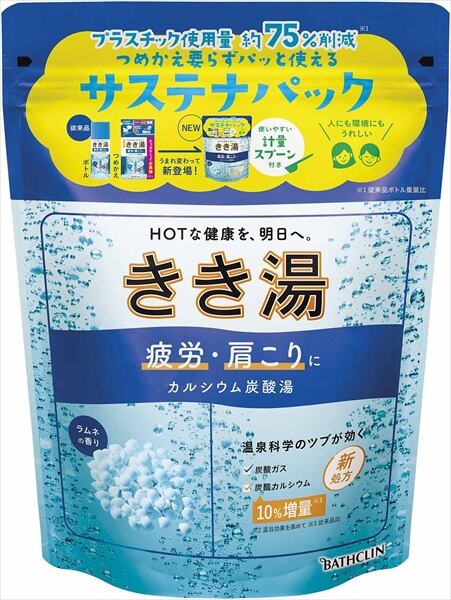 ■【説明】:カルシウム炭酸湯/疲労・肩こりに/ラムネの香り/青空色の湯(透明タイプ)●ボトル・つめかえ用から、環境配慮型の「サステナパック」へ変更。プラスチック使用量 約75%削減*4 *4従来品ボトル重量比。小さく丸めて捨てられる。つめかえ要らずでパッと使える。袋には安心して保管できるチャック付き。計量スプーンでチャックを閉められ、スプーンは容器にかけて保管可能。●新処方 温泉構成成分*2を10%増量