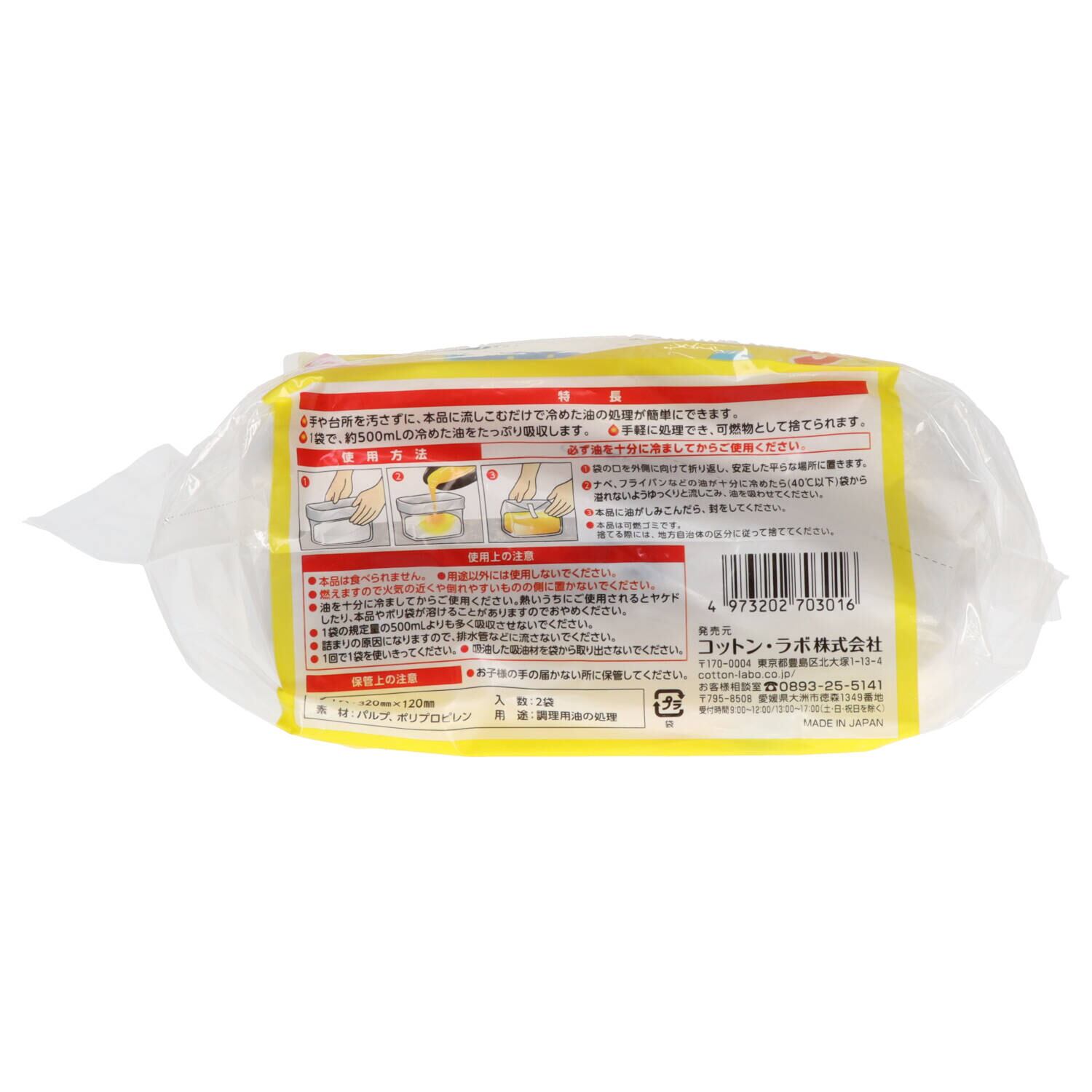 ■【説明】:冷えた油を注ぎ入れるだけで簡単に廃油処理ができます。500mlの油に使えます。2袋入り。