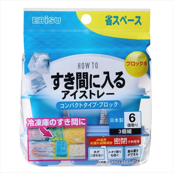 ■【説明】:アイストレーシリーズが使用シーンに合わせて選びやすいパッケージリニューアル。一度に6個の氷が作れる3個組(合計18個)。冷凍庫のすき間に重ねて置けて省スペースでブロック氷が作れる。使わない時もコンパクト収納が可能。JIS基準水漏れ試験適合の密閉フタ付きで、持ち運ぶ際や冷凍庫の開閉時に水がこぼれず、ニオイ移りも防ぐ。重ね置きもできるので大量の氷を作りたい時や作り置きに便利。日本製。