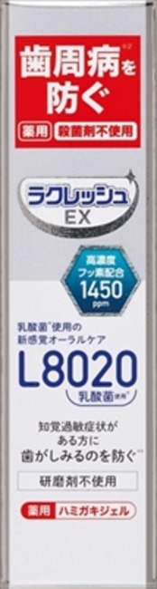 ■【説明】:L8020乳酸菌を使用した薬用ハミガキジェルです。薬用成分が、歯ぐきの炎症をしっかり抑えて歯周病を防ぎます。研磨剤不使用だから歯の表面を優しくブラッシングでき、炎症部に刺激を与える事が少ない。また、硝酸カリウムが、歯がしみるのを防ぎます。むし歯の発生と進行をする高濃度フッ素1450ppmを配合。