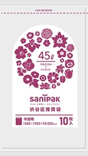 ■【説明】:渋谷区推奨ゴミ袋。袋に花柄をデザインし、ゴミステーションをお花畑にするプロジェクト商品。二酸化炭素削減素材を用いており、環境に配慮したゴミ袋です。
