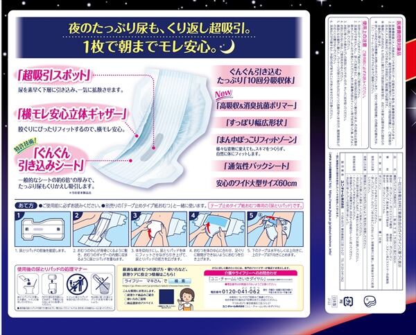 ■【説明】:たっぷり10回分をぐんぐん吸収するので、尿量の多い方でも一晩中安心な尿とりパッドです。
