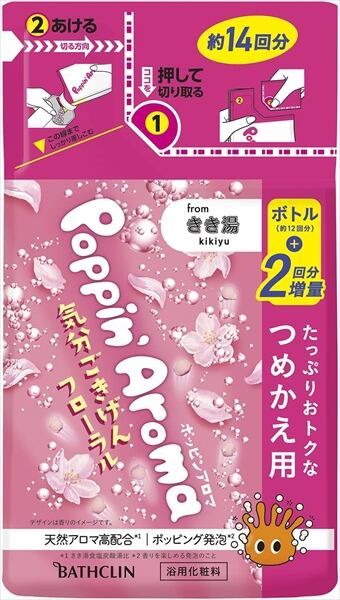 ■【説明】:踊るように湧き上がる発泡と、豊かに広がる香りを楽しめる炭酸入浴料。●「天然アロマ高配合※1」 ※1きき湯食塩炭酸湯比豊かな香りが、浴室いっぱいに広がり、じっくりと香りを堪能できます。●「ポッピング発泡※2」 ※2香りを楽しめる発泡のこと。ツブが踊るように、勢いよく発泡。見るだけで気分ハッピー。【香り】気分ごきげんフローラルの香り【お湯の色】ポップピンク(透明タイプ)