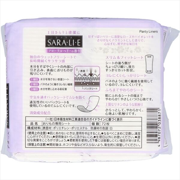 ■【説明】:●すばやくシート内部に引き込むウエットフリーシートで、表面に水分を残さず長時間サラサラ感が続くおりもの専用シート●柔らか新デザインシートに改良●清潔感、香り感あるパッケージに一新!