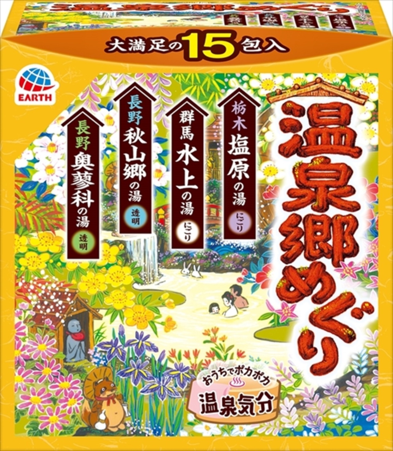 ■【説明】:●四季折々の温泉郷の雰囲気と湯けむり温泉気分がご家庭のお風呂で味わえます。●有効成分が温浴効果を高めて血行を促進し、身体を芯から温めます。●おうちでポカポカ温泉気分●薬用入浴剤●栃木塩原の湯【香り】澄みきった高原の花の香り【お湯色】乳藤色(にごり)【販売名】バスソルト EARTH u-1c●群馬水上の湯【香り】気分穏やか森林の香り【お湯色】乳白色(にごり)【販売名】バスソルト EARTH p-2c●長野秋山郷の湯【香り】風薫る渓谷の香り【お湯色】青色(透明)【販売名】バスソルト アース sc-1●長野奥蓼科の湯【香り】木漏れ日に咲く素朴な花々の香り【お湯色】緑色(透明)【販売名】バスソルト EARTH zc※本品は温泉を再現したものではありません。・Act For ECO・森林資源保全【医薬部外品】【効能】疲労回復、あせも、しっしん、にきび、ひび、あかぎれ、しもやけ、荒れ性、うちみ、くじき、肩のこり、神経痛、リウマチ、腰痛、冷え症、痔、産前産後の冷え症【内容量】栃木塩原の湯 30g×3包、群馬水上の湯 30g×4包、長野秋山郷の湯 30g×4包、長野奥蓼科の湯 30g×4包