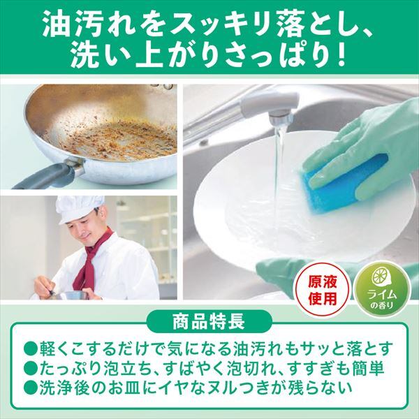 ■【説明】:油汚れをスッキリ落とし、すばやい泡切れの食器用洗剤。たっぷり泡立ち、素早く泡切れてすすぎが簡単です。洗うときもベタつかず、洗った後も手肌にイヤなヌルつきが残りません。植物由来洗浄成分配合で手にやさしい処方です。ライムの香り。原液タイプ。