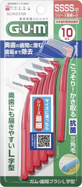 ■【説明】:歯間の歯周プラーク(歯垢)除去で歯周病対策。奥歯にも届きやすいL字型。抗菌三角毛がエッジでかき取るので歯周プラークを効果的に除去します。シリーズ最細タイプ。