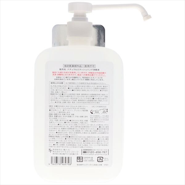 ■【説明】:高濃度エタノール消毒効果が最も高い弱酸性仕様で手肌にやさしく、広範囲のウイルスに効果がある保湿成分配合で手指の荒れを軽減食品にも使える成分のみで、キッチン・ダイニング用にも最適