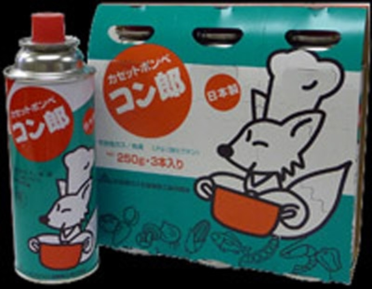 ■【説明】:きつねの「コン郎」が目印のカセットボンベ。ネーミングから、お客様に馴染みがあると親しまれております。製缶からガス充填まで一貫生産しております。