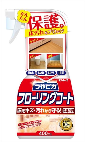 ■【説明】:お掃除のあとにスプレーしてサッと拭くだけで、床につくキズや汚れをカンタン保護。高いレベリング性能により均一で美しい仕上がりが実現します。さらに抗菌・防水効果で床のキレイを長持ちさせます。乾燥時間は10分、速乾タイプ。耐久4か月。