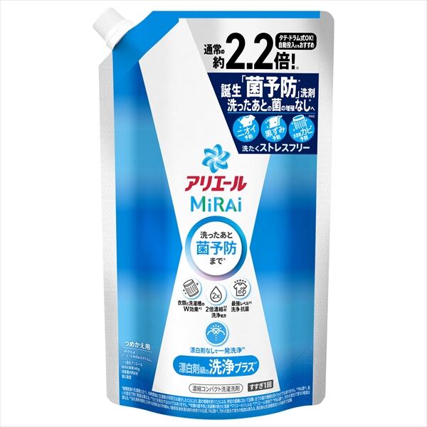 ■【説明】:アリエールMiRAi。誕生「菌」洗剤。洗った後の菌の増殖なしへ。濃縮コンパクト洗濯洗剤。衣類と洗濯槽のW効果。2倍濃縮の洗浄処方。最強レベル洗浄抗菌。漂白剤なしで一発洗浄。