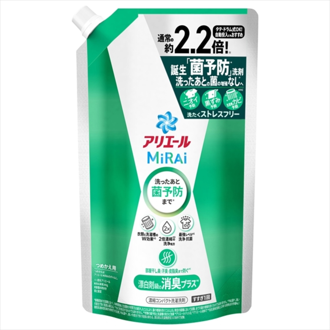 ■【説明】:アリエールMiRAi。誕生「菌」洗剤。洗った後の菌の増殖なしへ。濃縮コンパクト洗濯洗剤。衣類と洗濯槽のW効果。2倍濃縮の洗浄処方。最強レベル洗浄抗菌。部屋干し臭・汗臭・皮脂臭まで防ぐ。