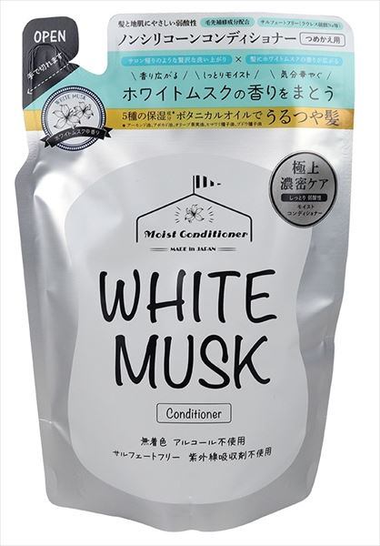 ■【説明】:ホワイトムスクの香りのコンディショナー詰め替え用です。ノンシリコン、髪と地肌にやさしい弱酸性 毛先補修成分配合 5種類の保湿成分配合 ボタニカルオイルでうるつや髪