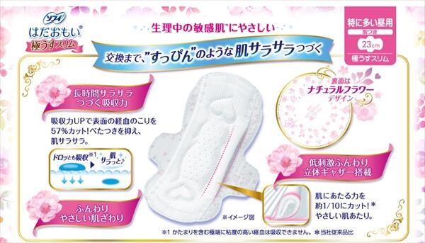 ■【説明】:はだおもいは、生理中の敏感肌にやさしいナプキンです。その理由は、長時間吸収力が持続して、交換まですっぴんのようなサラサラ感がつづくからです。