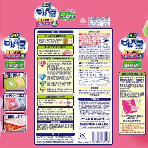■【説明】:フローラルソープの爽やかな洗いたての香りが広がります。大容量48個入り、引き出し24段分で使用できます。防虫効果は1年持続。
