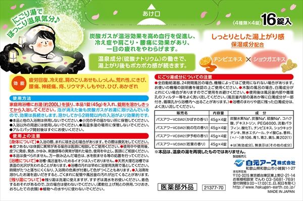 ■【説明】:4種類の風情漂う香りとにごり湯で、なつかしの温泉気分を楽しめる炭酸ガスの薬用入浴剤。炭酸ガスが温浴効果を高め血行を促進し一日の疲れをやわらげます。チンピエキスとショウガエキス(保湿成分)配合。
