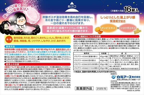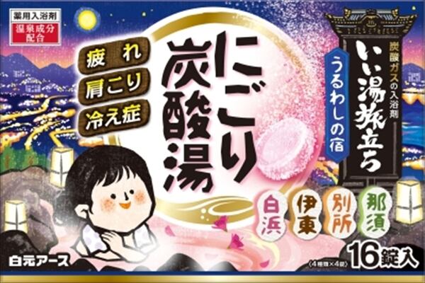 ■【説明】:4種類の風情漂う香りとにごり湯で、うるわしの温泉気分を楽しめる炭酸ガスの薬用入浴剤。炭酸ガスが温浴効果を高め血行を促進し一日の疲れをやわらげます。チンピエキスとショウガエキス(保湿成分)配合。