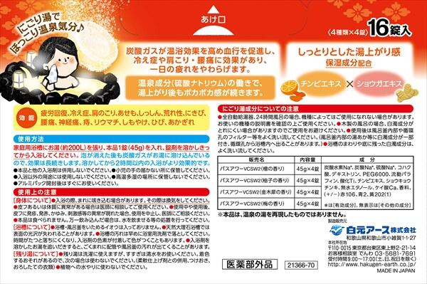 ■【説明】:4種類の風情漂う香りとにごり湯で、ぬくもりの温泉気分を楽しめる炭酸ガスの薬用入浴剤。炭酸ガスが温浴効果を高め血行を促進し一日の疲れをやわらげます。チンピエキスとショウガエキス(保湿成分)配合。