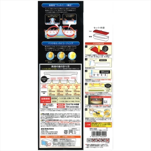 ■【説明】:家庭のレンジで、簡単・手軽に鍋ゆでよりおいしいパスタができる。余分なお湯を使わないので、節約にもなり湯切りもいらない。