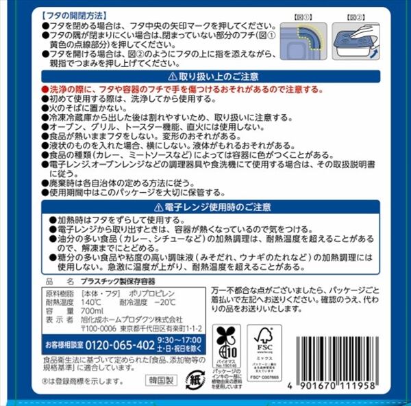 ■【説明】:軽くて丈夫なプラスチック製保存容器です。耐熱温度140℃耐冷温度−20℃で、冷凍保存からフタごと電子レンジ加熱までできます。異なるサイズ同士でも積み重ねて保存でき、使わない時は重ねて収納できます。底面とフタの凹凸で重ねた時にずれにくくなっています。フタの中央部分を押すとパチンと閉まって、しっかり密閉します。中身がひと目でわかる半透明の容器です。容器側面に目盛りが付き内容量が確認できます。