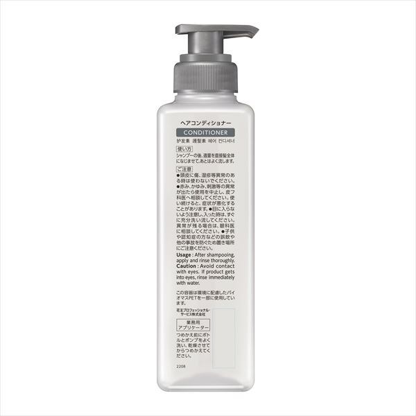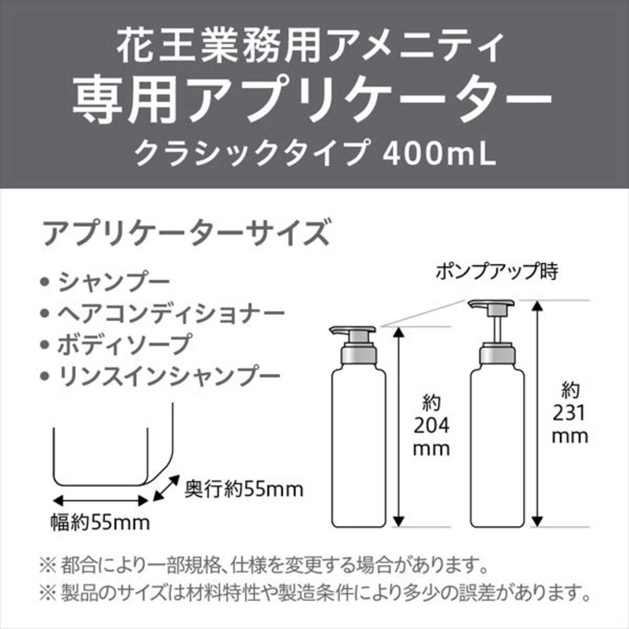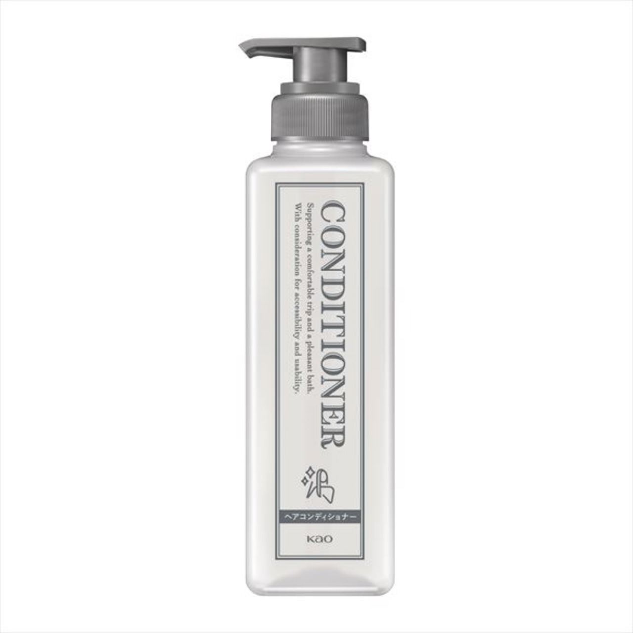 ■【説明】:花王業務用アメニティ ヘアコンディショナー専用の空容器。部屋置きにオススメの容量400mLタイプ。目を閉じても用途が識別できる触覚識別(凸状のきざみ)、直感的に伝わる識別ピクトグラム付き。外国の方のための多言語(英語・中国語・韓国語)表記対応。