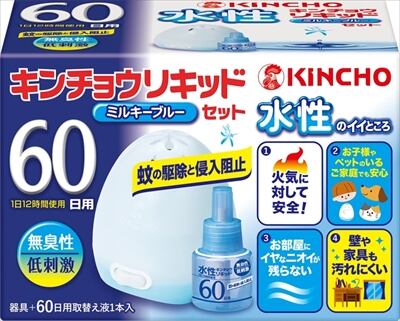 ■【説明】:液体電子蚊取り器具と、60日用取替液とのセット。水性処方で、安定した殺虫効果と火気に対する安全性を兼備。蚊の駆除と共に、屋内への蚊の侵入も阻止します。無臭性。