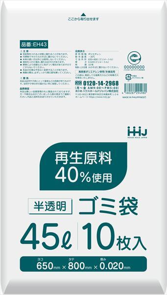 【まとめ買い】EH43 再生原料40%入 45L 半透明 【 ハウスホールドジャパン 】 【 包装・梱包 】【HRM-22733178-1】×80点セット