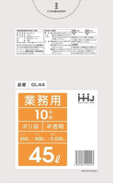 【まとめ買い】ポリ袋45L半透明10枚0.03mm GL44 【ハウスホールドジャパン】 【ゴミ袋・ポリ袋】【HRM-22529727-1】×60点セット