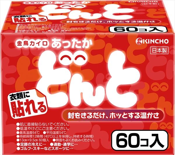 ■【説明】:封を切るだけで暖まる、粘着剤付きの衣類に貼るカイロ。大容量タイプなので、ヘビーユーザー様におすすめです。約12時間持続。60個入。