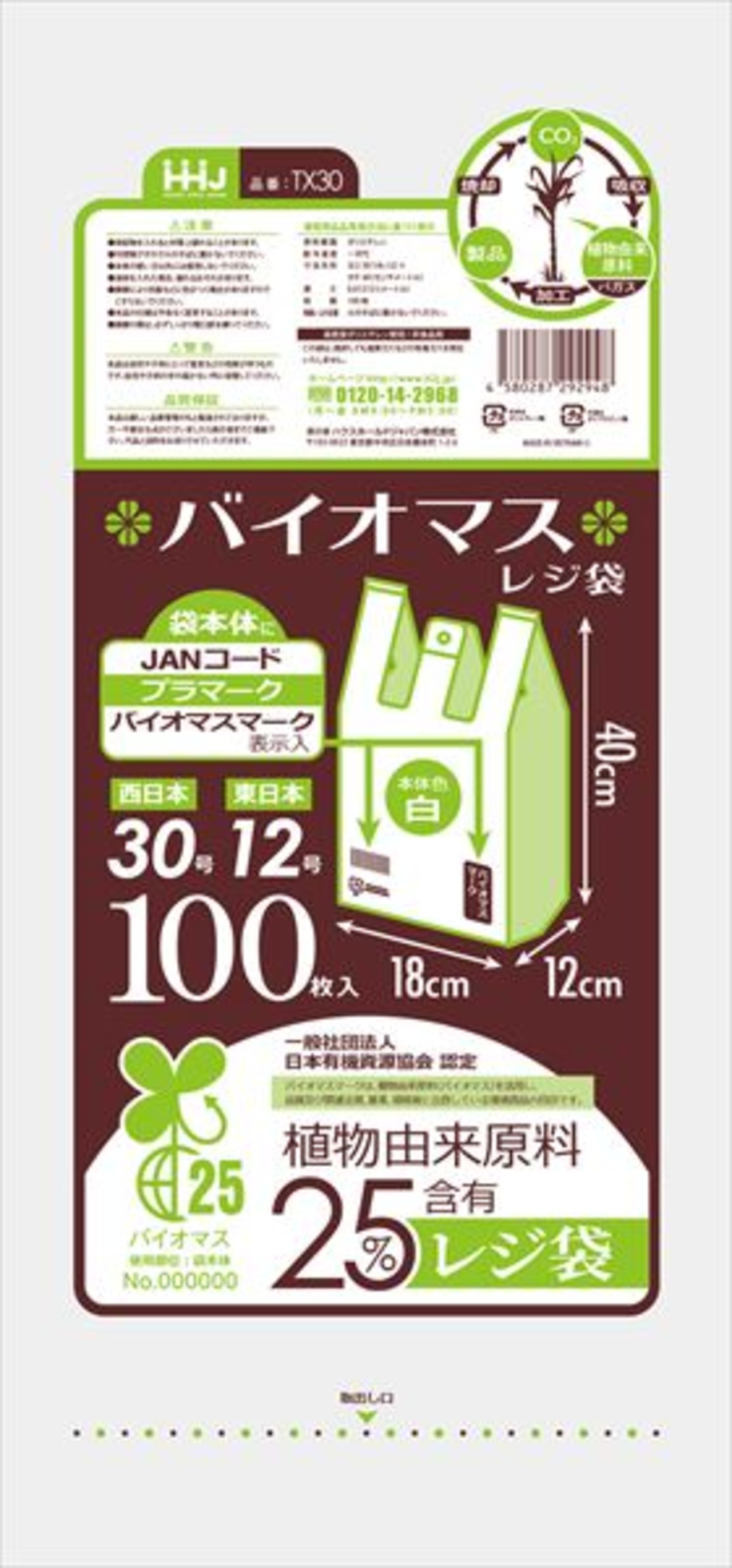 ■【説明】:TX30バイオマス配合25%レジ袋30号白100枚